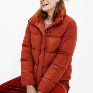 A funnel neck and dropped shoulders shape this warm and sporty puffer jacket with covetably fresh cool factor. Funnel neck. Zip front. Long sleeves with elasticized cuffs. Front snap welt pockets.