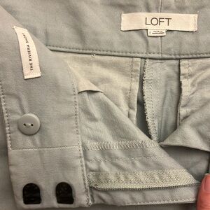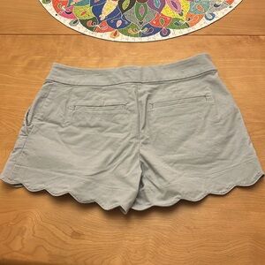 Light blue short with flattering scalloped hem. Slash pockets on the sides, faux pockets on the back, and zipper / double hook closure. 97% cotton & 3% spandex. 4” inseam
