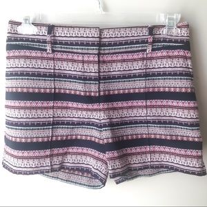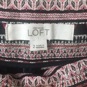 Loft Riviera shorts. Jacquard fabric. Front and back pockets that are still sewn shut! Double hook and button closure with zip fly. Belt loops. Pleating down the front of shorts. Color looks to be pinks and a very dark navy (kind of looks black to me in some light)