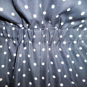 Gray and white polka dot jumpsuit, with cuffed shorts and elastic waist. Invisible zipper at the back. Material is not stretch.