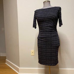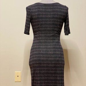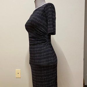 Ruched hip dress that cuts just above the knee. Stretchy, light, comfortable, and flattering fabric.