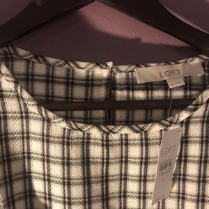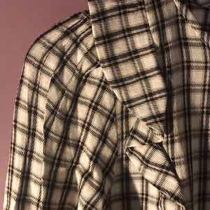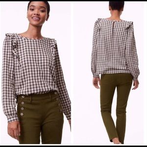 Brand: LOFT Description: Long sleeve plaid top with ruffle detail at shoulders Color: Cream, tan, and black Material: 100% cotton Size: Small Chest Measurement: 19" across laying flat Length: 22" from shoulder to hem Condition: New with tags