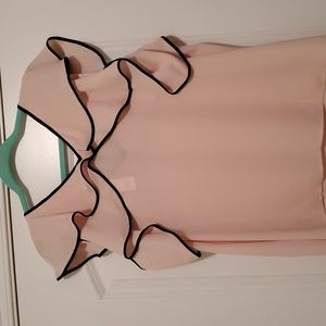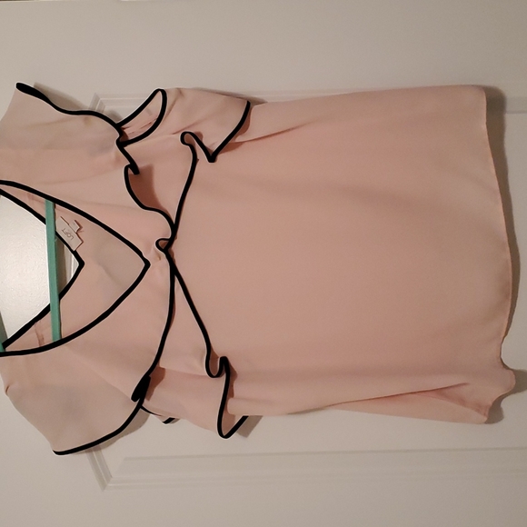 Brand new with tags, never worn, Loft ruffle blouse with ruffle sleeves. Very pretty and feminine. Size L, 100% Polyester. Can be worn either dressed up or down.