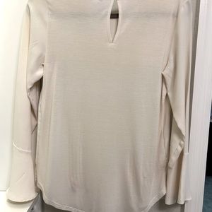 Beige soft ruffle blouse with button closure at back of neck. A very small snag (see picture) on the back from where a wire hanger got caught, otherwise in good condition. Priced accordingly. All items come from a smoke-free home.