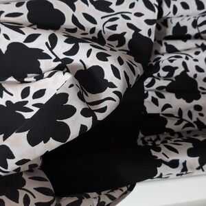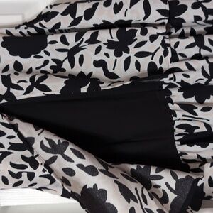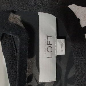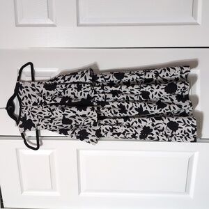 Loft Dress with a ruffle top half. Ruffle opens in the back to reveal a black underlay. Cream, white and black floral pattern. Size 0