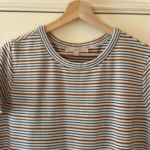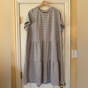 Cute and comfortable Loft dress with tiered ruffle bottom. Short sleeve, round neck, stretch material. Size XL. Approx 22โ wide at bust and 39โ long.