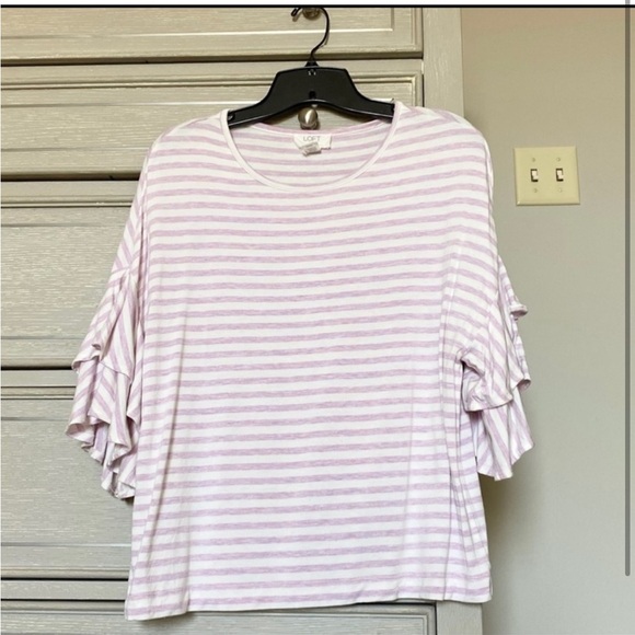 Light purple & white striped top from loft. Exaggerated ruffle sleeves. Scoop neck. Super, super soft and comfortable because it’s Lofts lounge line. Size small. Could fit a medium as well.