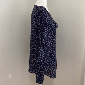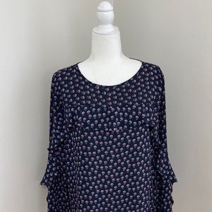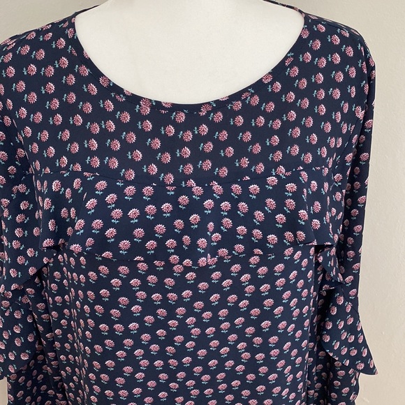 Pretty navy blouse with adorable ruffle detail that extends to the sleeves. Excellent condition.