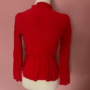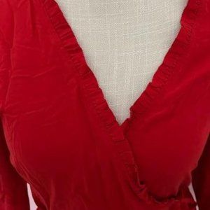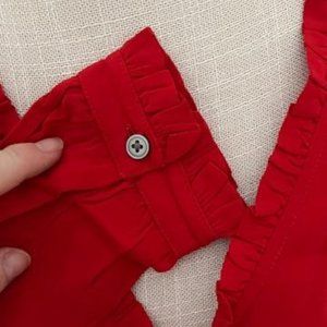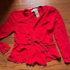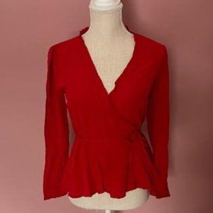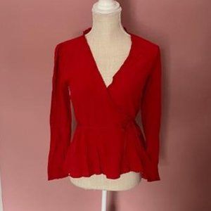 Loft Ruffle Wrap Blouse. NWT. Beautiful petite solid red, long sleeve wrap blouse. Neckline and sleeves have pretty ruffle detail (small scale so it's not overpowering). Blouse wraps and ties in front. Sleeves have button closure. 100% rayon, machine wash.