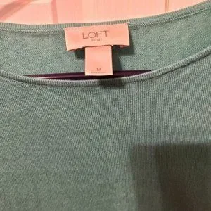 very flattering and light sweatshirt, ruffles on side, color is a soft turquoise, great condition