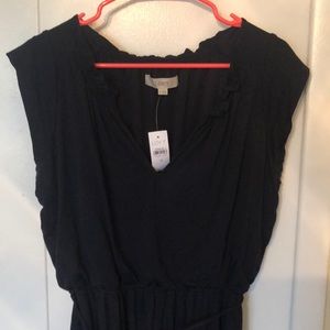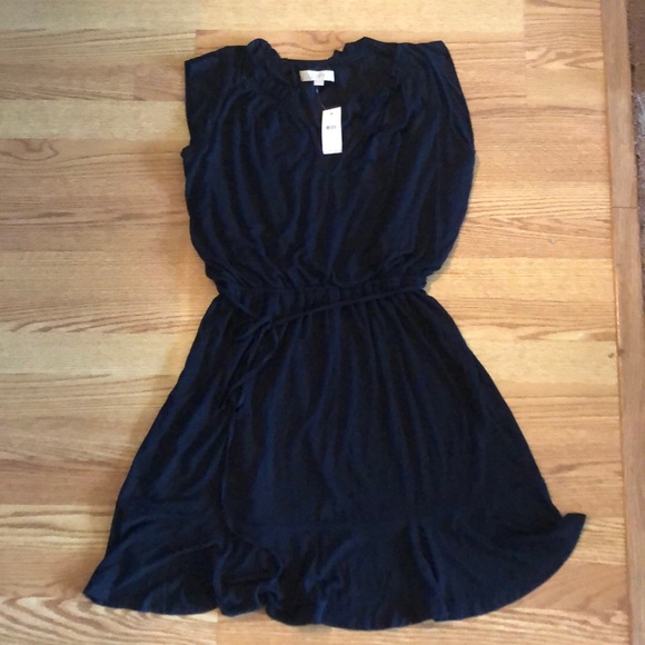 Navy blue dress, split neck with ruffle detail on the bottom. Ties at the waist