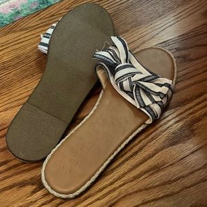 Never worn flat slide sandals with great cushion! Espadrille side and a blue and cream tie