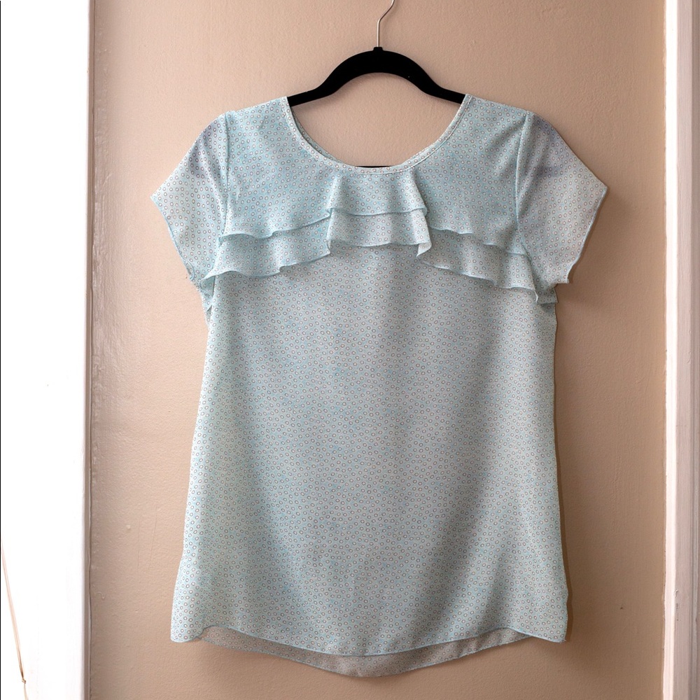 Like new Loft light blue ruffle sheer top. Cute print! Great to dress up for work or wear with jeans. Size small