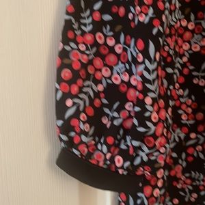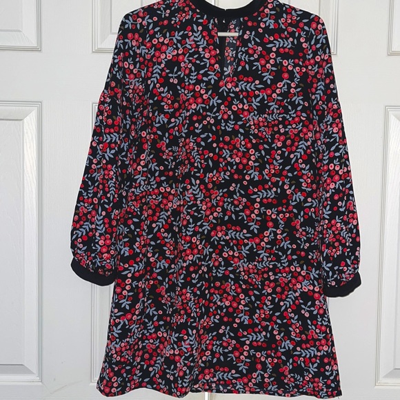 Dress has red and peach blossoms with grey leaves and a few brown leaves. Neck and leave cuffs have a black velvet trim. Cute with black tights and booties..