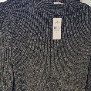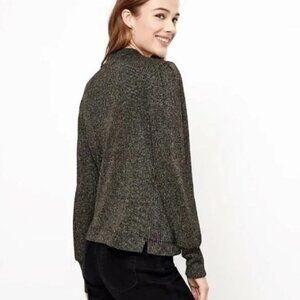 with puffed sleeves and a shimmery finish, this ribbed mock neck top is the prettiest take on effortless polish
