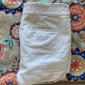 White with beautiful lace on waist and pockets, zipper with lactch hooks, super cute dressed up or down