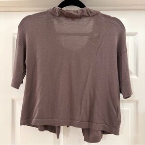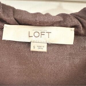 Loft Short Sleeve Ribbon Tie Gathered Neckline Cardigan Sweater in a Dark Taupe / Gray color. Size small. Excellent condition. Adjustable ribbon tie at neck.