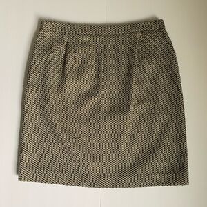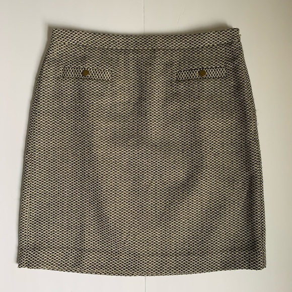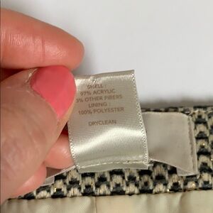 Details: Cream, black & gray pattern with gold thread used throughout the skirt. Two buttoned pockets in the front. Side zipper. Lined. Size 0. Perfect for work. EUC. See picture 6 for material & care.