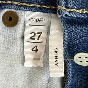 Loft Slim Pocket Side Trim Raw Step Hem Skinny Jeans - Size 27. Good pre-owned condition. Minor signs of normal wash wear and there is a very faint darker area on one of the stripes, pretty sure it's just a surface spot. As you can see, it was hard to even get it to show up for the picture. Medium wash, mid rise, skinny fit, raw step hem, ankle length, 5 pockets, zip fly with button closure, some stretch. Approximate measurements: 14 1/2" waist, 9 1/4" rise, 27" inseam.