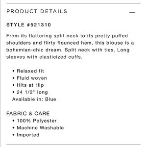 Very pretty blouse. Navy blue satin-like material. Elastic cuffs at the wrist. Ruffle extends around the bottom.