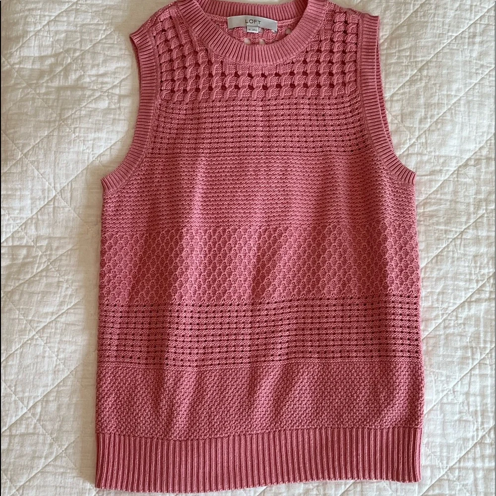 This Loft spring sleeveless sweater is the most fun salmon color. With lovely detailed stitching, this is a piece that can easily be worn business casual, dressed up with a skirt, or dressed down with a cute pair of your favorite denim shorts.