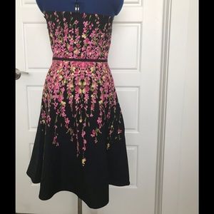 Beautiful cascading pink flowers really pop off this black dress. Shell: 100% Cotton. Lining: 100% Acetate. Has a place to add straps, not included. Side zip closure. Stored in a smoke free environment.