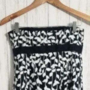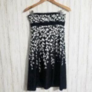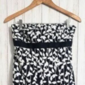 Lovely Ann Taylor Loft black strapless A-line dress with white vines falling around the waist. The optional straps have been removed. Concealed zipper on the back. Shelf bra in the inner bust. Ribbon on the empire waist. Fully lined.