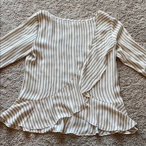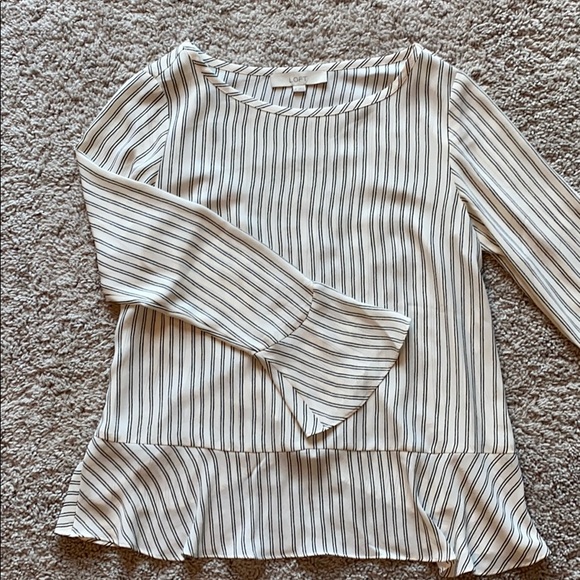 Black and white stripe blouse from loft. Only worn a couple of times. Ruffle at the end of sleeves and bottom of the shirt, as well as a diagonal ruffle up the back. Offers via offer button only please :)