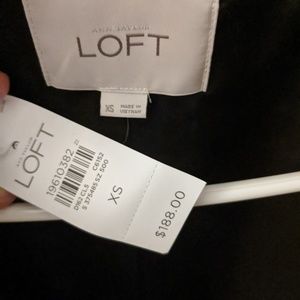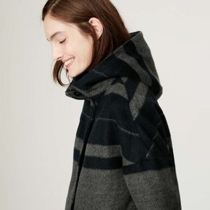 Brand-new (never worn) cocoon-style coat with black and grey stripes. Fleece material lines the hood and the jacket itself is so soft. Hidden pockets and zipper and snap front. Drop shoulders and hidden pockets.Tag is still attached. It has been sitting in a closet (with mothballs) for a few years.