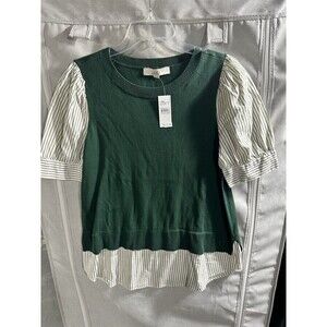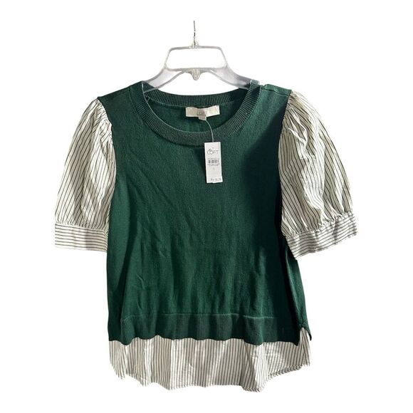 Loft Striped Layered Mixed Media Poplin Short Sleeve Blouse Green Cotton Small