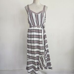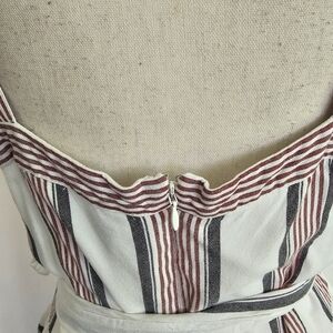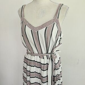Loft white, red, and blue striped dress with faux wrap ruffle skirt, back zipper, and waist sash.