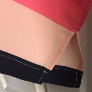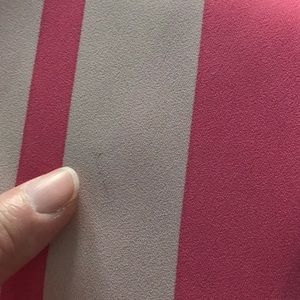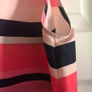 Super cute 100% polyester shell with side slits, back keyhole closure. Varying shades of pink with navy stripes. There is a line mark on the front chest area and side back, both noted in photo, which may be from being in storage during our move and could come out with a little TLC. Other than that excellent condition with no pilling or snags. The ribbon hangers have been removed.