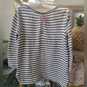 -Pre owned cute modern striped sweater! Three quarter sleeves. Striped transitional sweater features grey and cream stripes! Crewneck sweater. Perfect for autumn / fall winter or spring. Cotton and polyester blend; Sweater is a thick warm material and zips up the back with a pink zipper. Machine wash!
