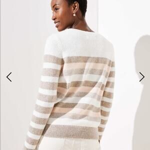 knit, textured, soft knit, lounge, cozy, comfy, soft, comfortable, loungewear, loose, relaxed fit, preppy, fall, autumn, spring, transitional, springy, winter, warm, layering, outdoor, classic, casual, basic, chic, crewneck sweater, striped, tan, cream, oatmeal, ecru, white, gray, grey, striped, wool blend, fuzzy, soft, pullover, Loft sweater