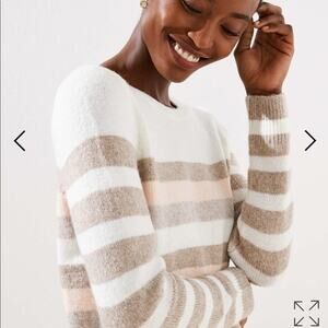Loft Striped Wool Blend Long Sleeve Crew Neck Soft Knit Pullover Sweater Size XS. Pullover style sweater with a fuzzy soft knitted construction, crew neck, and long sleeves. The striped pattern adds a stylish touch to this cozy sweater, while the wool-blend material ensures warmth and comfort. Perfect for layering or wearing on its own.