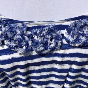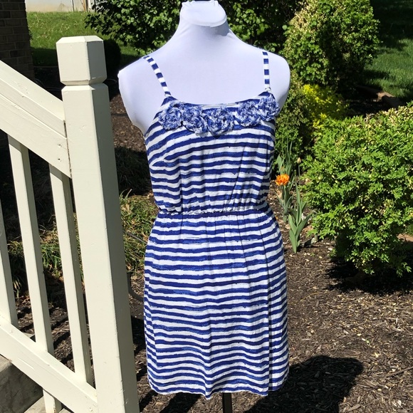 Cute striped sundress with “flower” detail along the neckline. Great for a day out shopping or a backyard cookout. Add a little sweater and can be worn in a casual office setting.