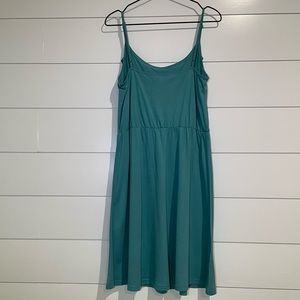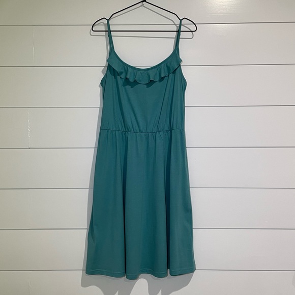 Loft teal sundress with cute ruffle detail in front. Adjustable spaghetti straps and hits right below knee. 100% cotton.