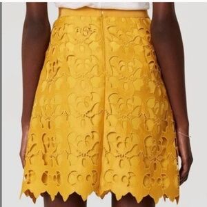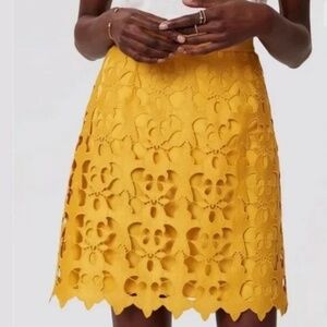 Loft Sunny Days marigolds yellow cutout lace overlay skirt. Size 4. Fully lined with dyed to match fabric. Grosgrain ribbon waist band. Hidden back zipper. Can be worn with a silk blouse or with a t-shirt and denim jacket for variety.