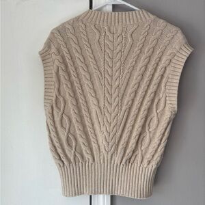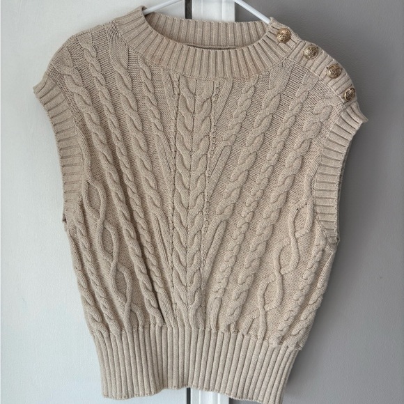 Chic cable knit design. Features button accents on shoulder. Perfect for layering.