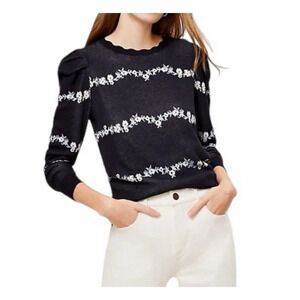 Loft Sweater Floral Cottage Country Round Neck Pullover XL Blue Puff Sleeves NWT
