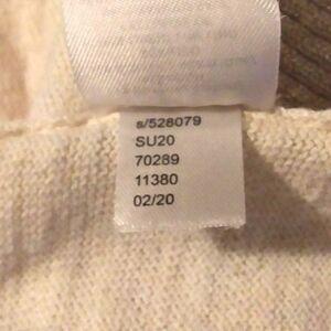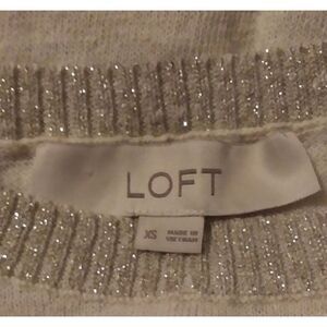Cotton, linen and acrylic blend lightweight Loft sweater with 3/4 length sleeves, slight high low hem , almost cropped with pretty neutral creams and some sparkle. It has a modern flowy, oversized kind of boxy look. There is champagne gold metallic ribbing at the round neck, end of sleeves and the hem. It has a classic elegance to it but also has a beachy, coastal and mellow vibe if you choose to dress it down with some jeans and casual shoes or boots. It is lightweight and breathes well. No overheating in a crowded room. It will look great with all kinds of bottoms for the office especially with a great pair of flats with a little gold bling. And, it is easy to throw a blazer over it and add some great jewelry. Great day to night look. It is new without tags and has no flaws.