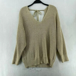 Loft Sweater Women's Sz 14 Plus Beige Knitted V-Neck Gold Metallic Tie-Back