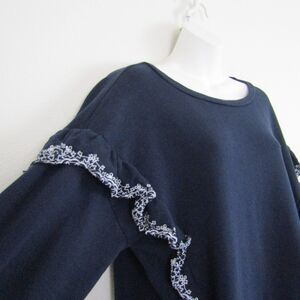 Loft sweater - pullover, crew neckline, 100% cotton terry, ruffle trim and eyelet embroidery on trim. Navy blue.