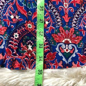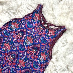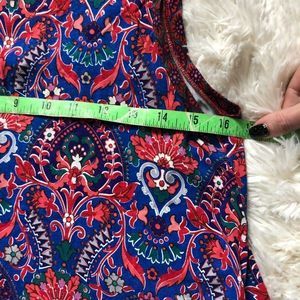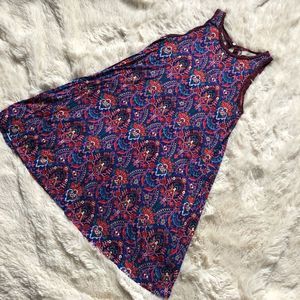 Loft sleeveless swing dress, in good under condition. Super soft buttery material, light weight. Pattern in blue, purple, red, green. Keyhole back. Pattern pictured up close, measurements of bust and length included.