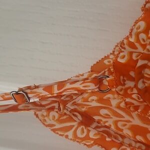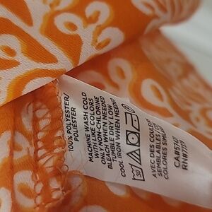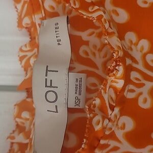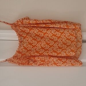 silky feeling tank from loft. size xs petite. beautiful tangerine orange color with white pattern. adjustable straps, flowy and flattering fit, with slight v neckline.