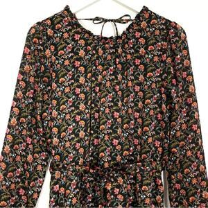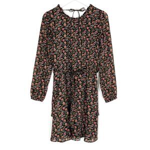 Long sleeved dress with tiered skirt and tie at back neckline. Floral print with metallic detail.