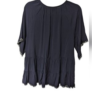 This top is in gently used condition. It is a lightweight silky style material. It has tiered details on the body. It also has scalloped edging on sleeves and hem. Please see photos for details.