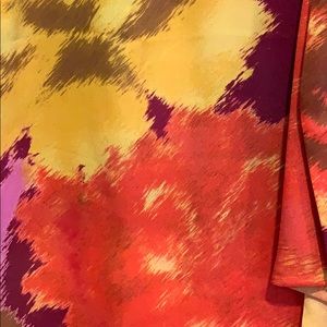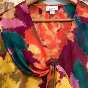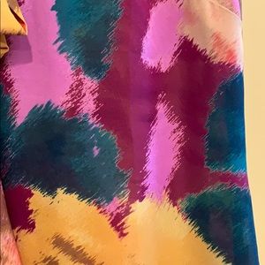 The colors on this top are truly gorgeous and vibrant! Please check the pictures for this unique neckline. It has a broader shawl that is tied in a bow on the right hand side, this is the way it is designed. In excellent condition. 100 % polyester so it is very breezy and comfortable. Thanks for 👀!