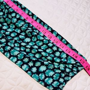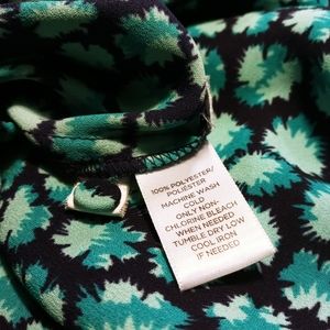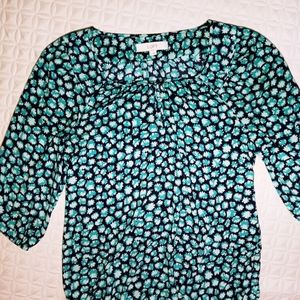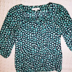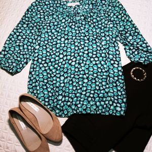 Ann Taylor Loft top in navy blue, turquoise, and mint color. Very light flowy material scoop neck collar with three button front. 100 % polyester. 3/4 sleeve with elastic cuff. Also has elastic waistband. Gently worn , no noticable flaws.