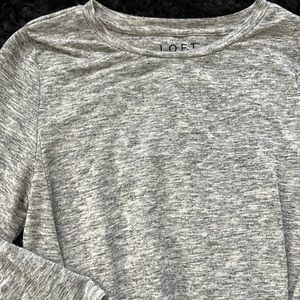 Fitted at the chest, loose in the stomach. Sleeves are 3/4
